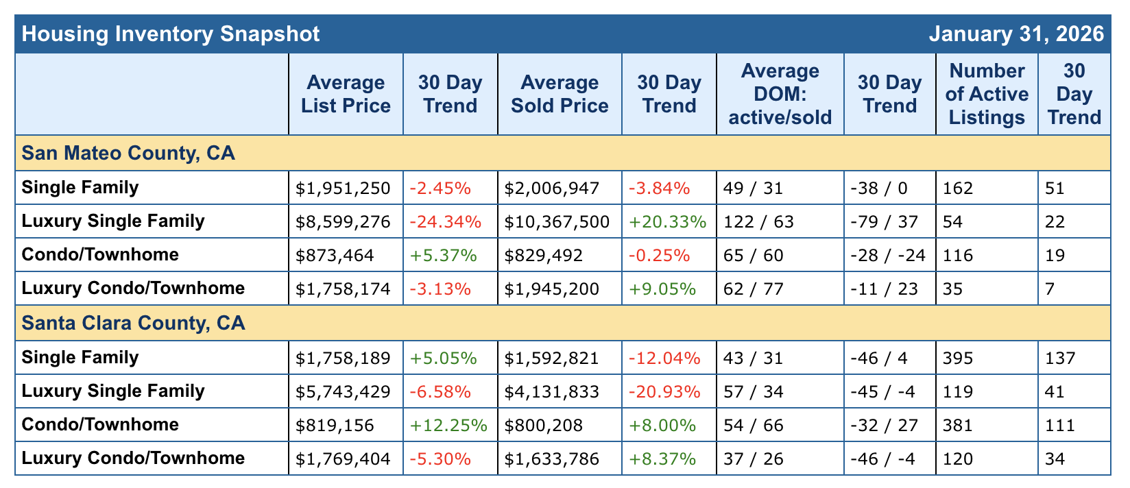 The stats are in for Jan 2026 and December 2025. We saw a healthy December in San Mateo County with some adjustments in January. In my experience, in line with the habitual behavior of buyers in Winter. Condos are going strong, for those without balcony issues – which is a good indication of growth. We see the condo market as the first step to home ownership so we want to see healthy sales there, as buyers sell their condos and move into larger spaces, opening up that first rung to the next buyer.