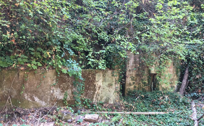 We were so excited as we turned onto the road, meandered through the canopy of trees where shadow and light danced and.  As we fast approached the address, the creek came into view, then the for sale sign at the end of the road.  I grabbed my backpack and camera, tightened up the shoes – I was ready to survey the land.  Then we realized we were looking at it.  The useable lot was no bigger than a family room.  Most of thee land was up hill – to say the least.  It wasn’t what we expected.  We found what once was the foundation of a home long before.  Now complete ruins.  Made me feel a bit like Indiana Jones – standing there – looking at what just 30 years can do to a piece of land and wonder – what the heck was that?