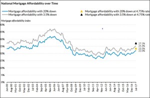 At current interest rates and based a median family income, you’d need about 22 percent of your income for monthly payment with a 20-percent-down mortgage and about 24 percent with a 3.5 percent down payment. And, should rates rise to 4.75 percent by the end of this year, a buyer putting 20 percent down would pay about 25 percent of his monthly income and a buyer using a low-down payment loan at 3.5 percent down payment would pay about 28 percent of the buyer’s monthly income.