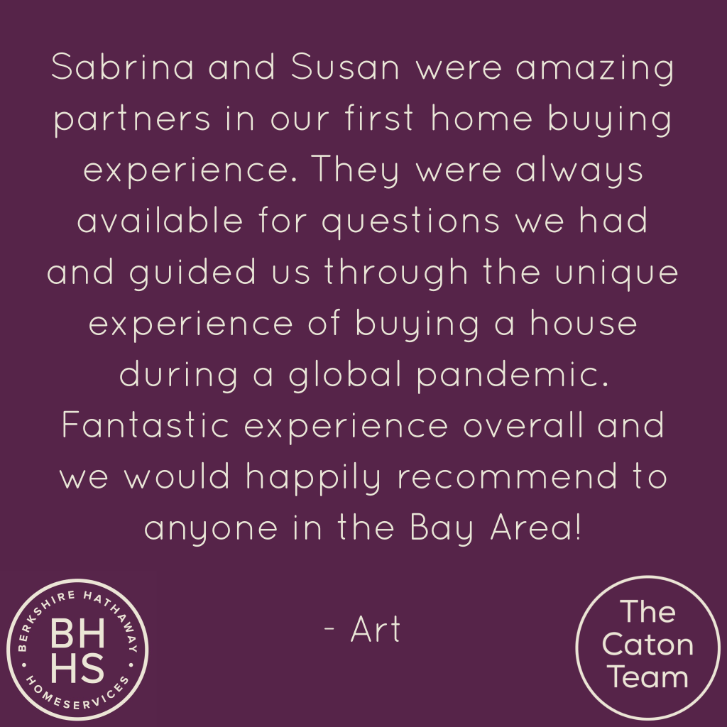 “Sabrina and Susan were amazing partners in our first home buying experience. They were always available for questions we had and guided us through the unique experience of buying a house during a global pandemic. Fantastic experience overall and we would happily recommend to anyone in the Bay Area!”