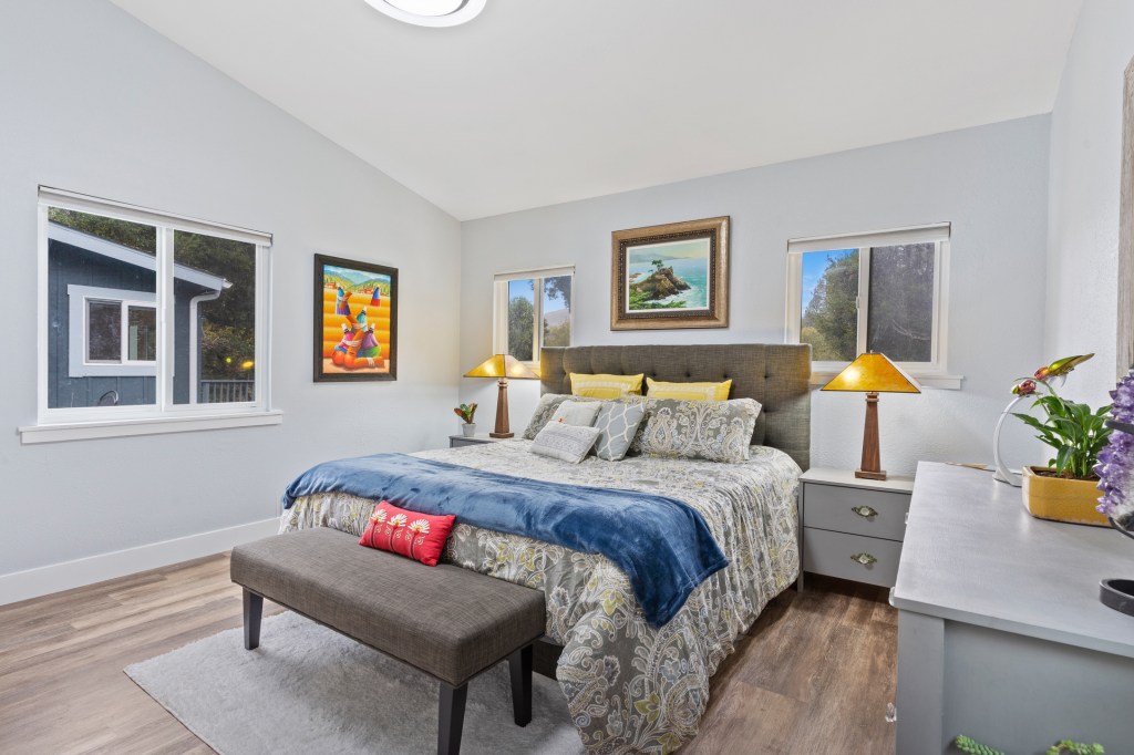 Whether you call this your full-time home or a weekend retreat, this charming & light-filled 2 bedroom/2 bath Cuesta La Honda cottage is sure to please. Updated from top to bottom with new diagonal vinyl plank flooring, dual pane windows & remodeled baths. The galley kitchen includes granite counters, glass tile backsplash & stainless steel appliances. A large formal dining room features an artistic ceiling, stained glass & custom french doors leading to the spacious outdoor deck. The living room includes a cathedral ceiling & unique ceiling light fixture/fan/bluetooth speakers with multi color lights. Off the second bedroom hall is the main bath featuring a stunning stone & glass tile shower, designer vanity & gold fixtures. The light-filled ensuite includes an updated bath with furniture quality vanity, brushed nickel fixtures & shower/tub. Outside is a fully fenced yard including a spacious deck & lower level covered flagstone patio and fire pit. A basement laundry room with washer/dryer is located near the deck. The La Cuesta Homeowner Association offers trails, pond, tennis court, pool, house arena, club house, playground, sport court, community garden & events. Off 84 West, close to the coast and a scenic drive to the Bay – are you ready to come home?