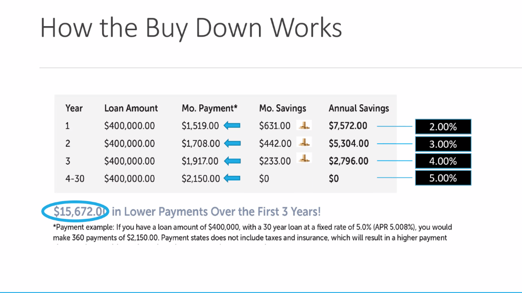 Welcome Home Funding is offering a RATE BUY DOWN. Take a look at the example below. Year 1 – the interest rate is nice and low, getting a buyer into a property and each year it goes up a point*.