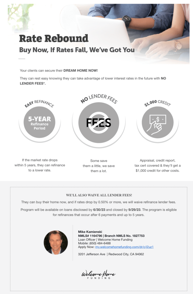 Next up is the Welcome Home Funding – RATE REBOUND. No one knows when the market will peak or where interest rates will land but with RATE REBOUND a buyer can rest assured that if rates drop further they can take advantage of the lower rate with NO lender fees on the refinance within 5 years of their purchase AND get a $1000 credit to go towards third parties fees associated with refinancing – like the appraisal report and new credit pull. Please note this product has a promotional lifespan. Homes must be IN Contract by 6.30.2023 and Close Escrow by 9.30.23 to qualify. Please note lender fees do apply to the original purchase loan with Welcome Home Funding.