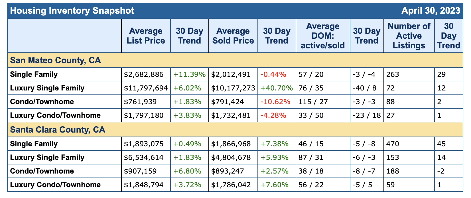 Here are the stats for San Mateo and Santa Clara Counties for April 2023