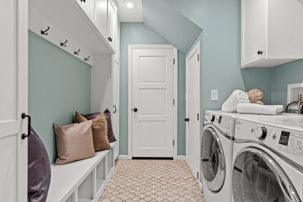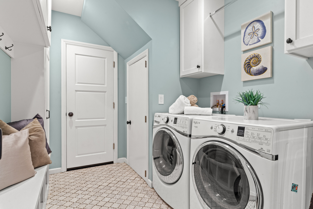 Step through the hallway, you’ll note the laundry/mud room connecting to the one-car garage. This space features a free-standing washer and ventless dryer, shelving, bench, and extra storage – thus rounding out the front portion of the home.