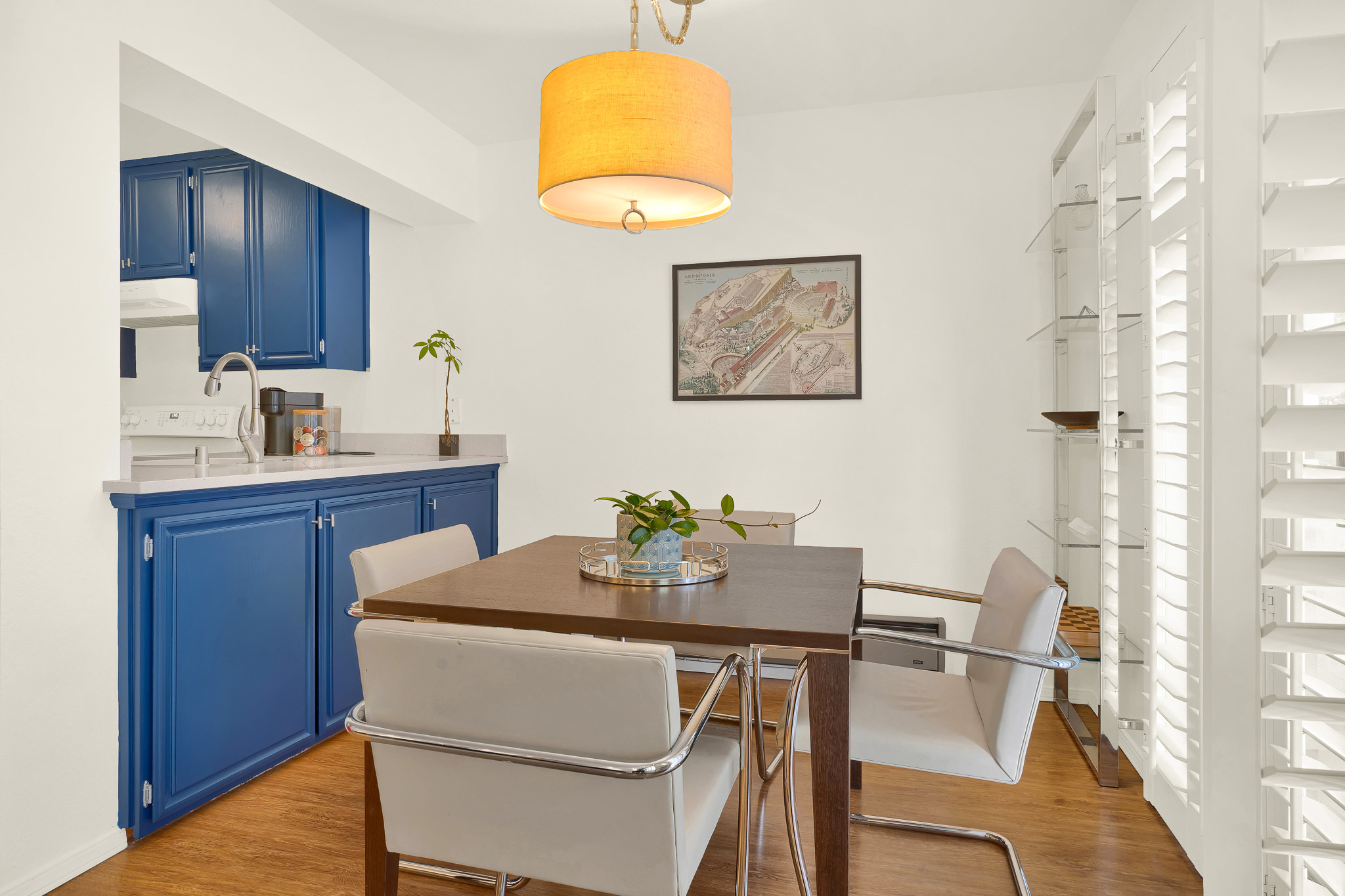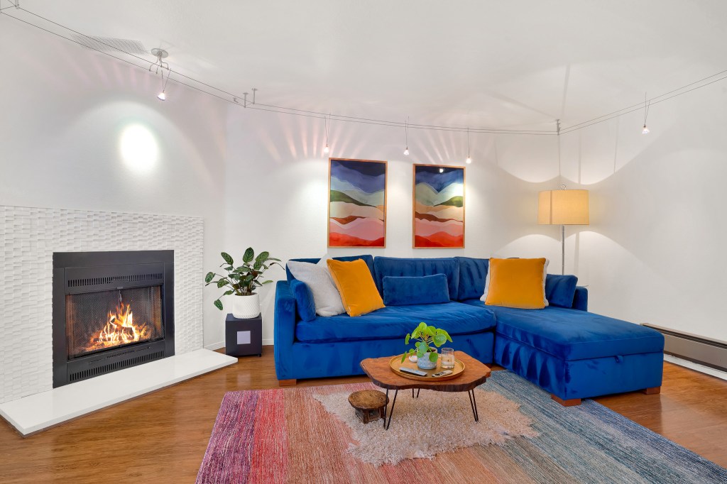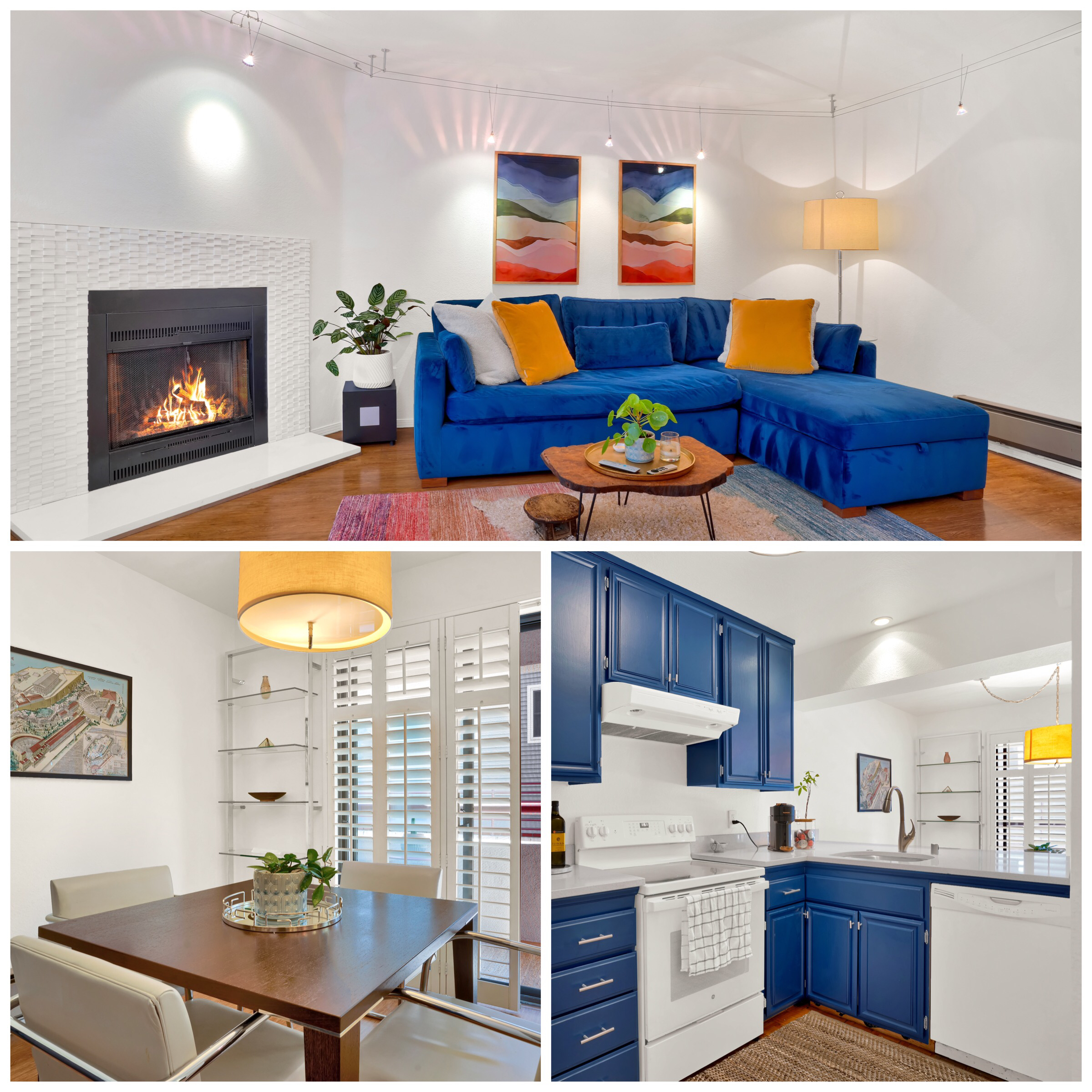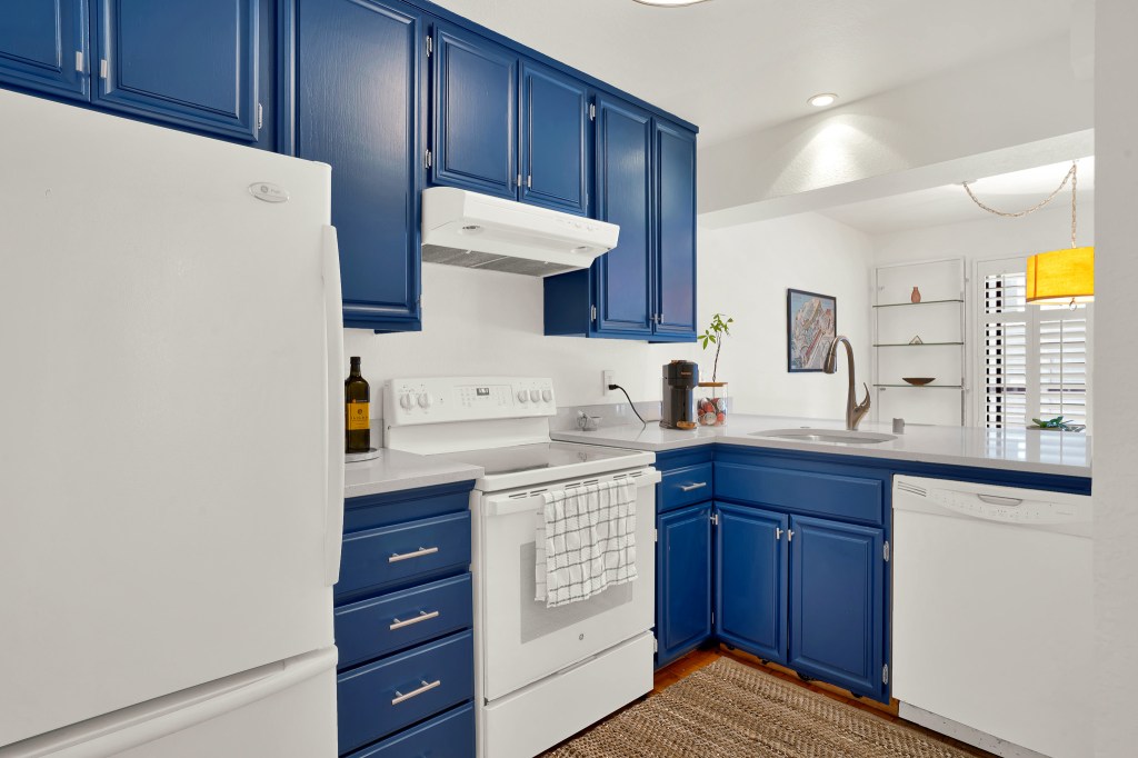- Enter into the living area where you’ll spot the joyful blue cabinets and gorgeous quartz countertops of the kitchen. With a dishwasher, newer stove and a full-size refrigerator, the kitchen opens out into the dining area. Perfect for entertaining.