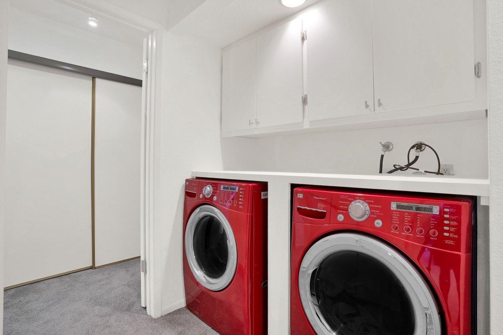 - FULL SIZE Laundry area upstairs. All appliances come with the home. Also included with the home: Blue sofa, red mirror, red TV stand, all living area built-in shelving along with the dining set. Bedroom set and night stands also available.