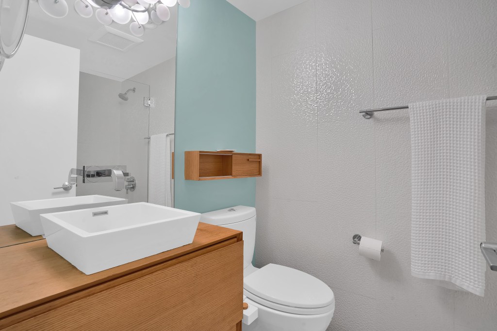 - The Second bedroom has a hall bath with updated shower over tub, riverbed tile flooring, fun lighting and beautiful sink.