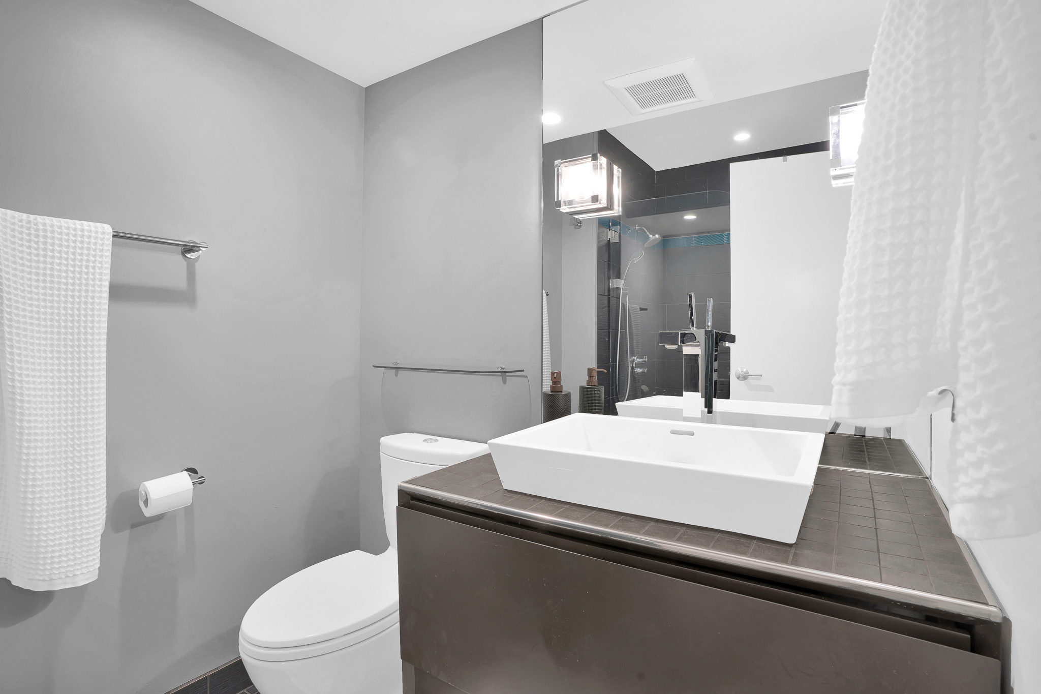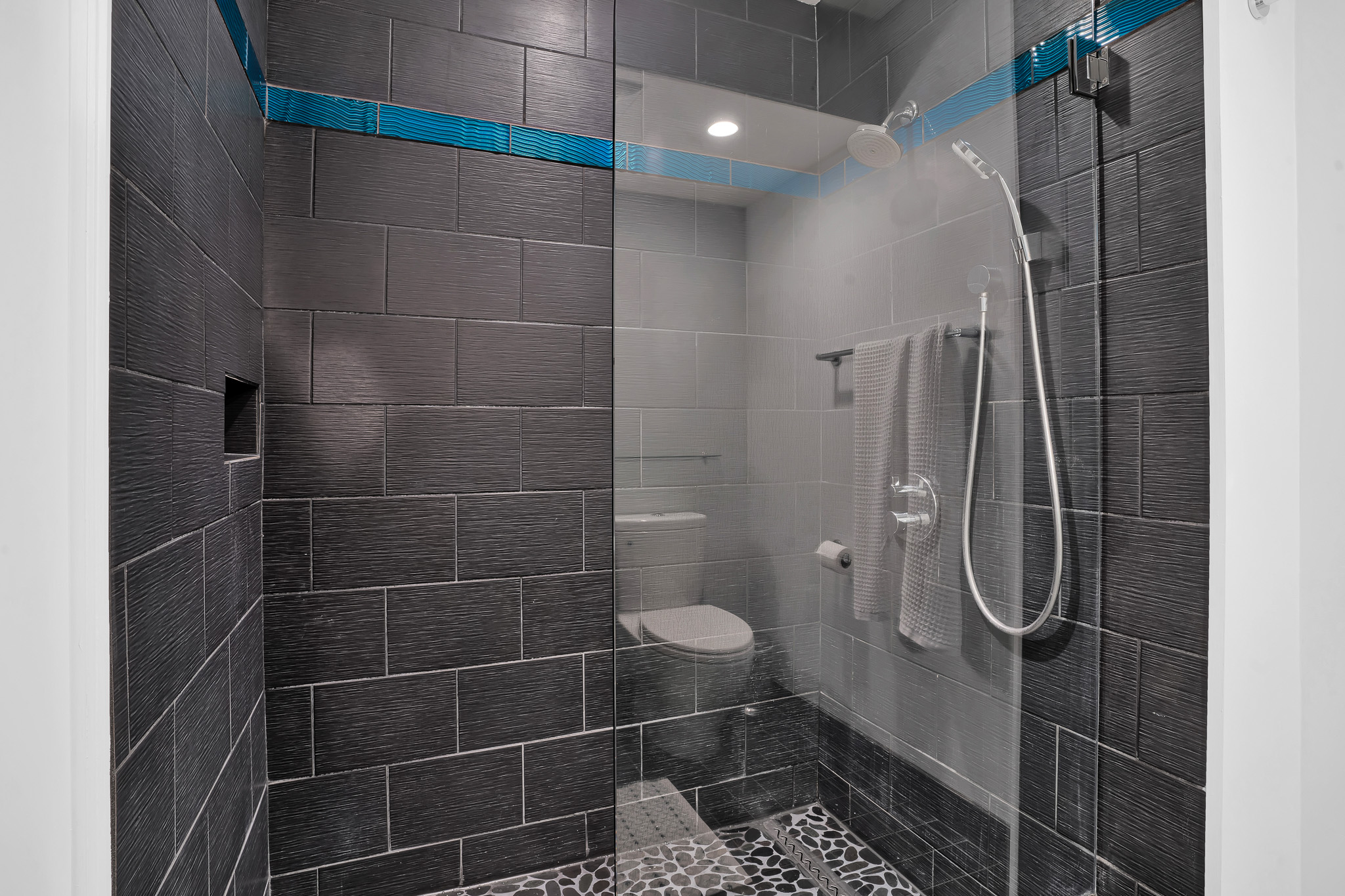 - Upstairs features a primary suite, with ample closets and gorgeous remodeled stall shower with sleek black tile..