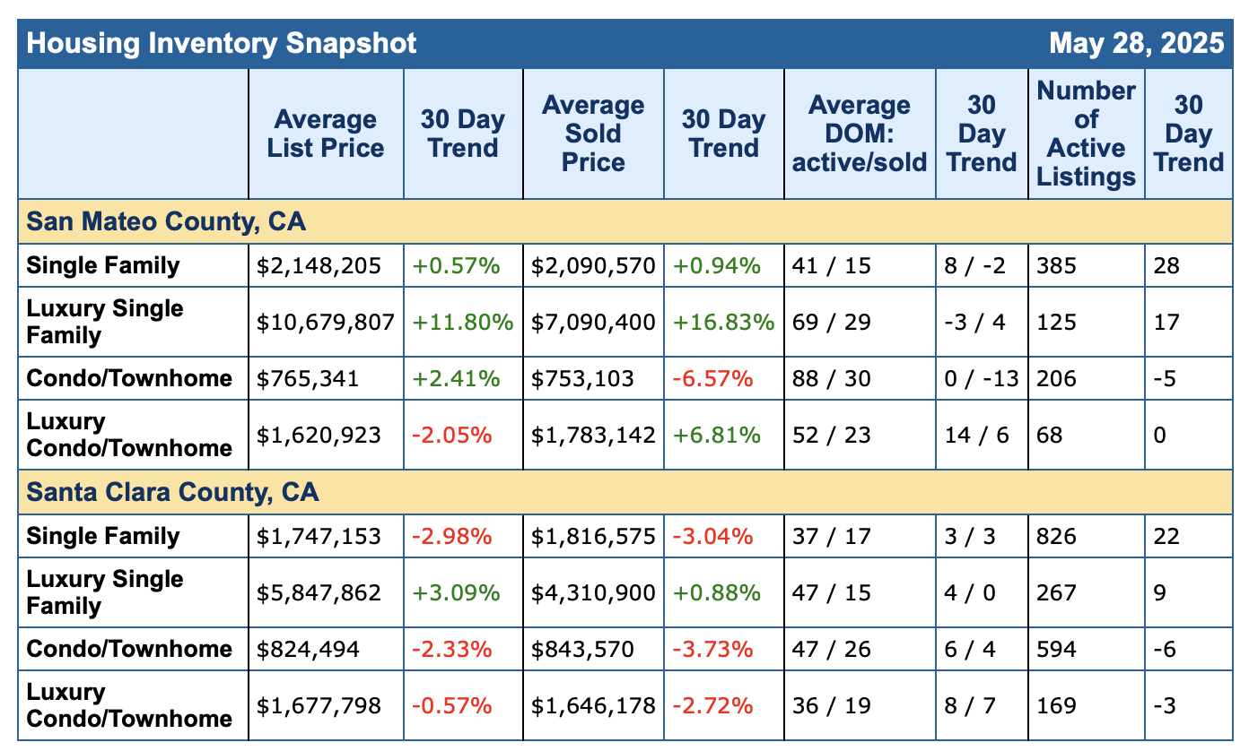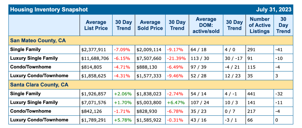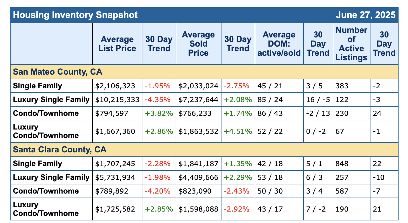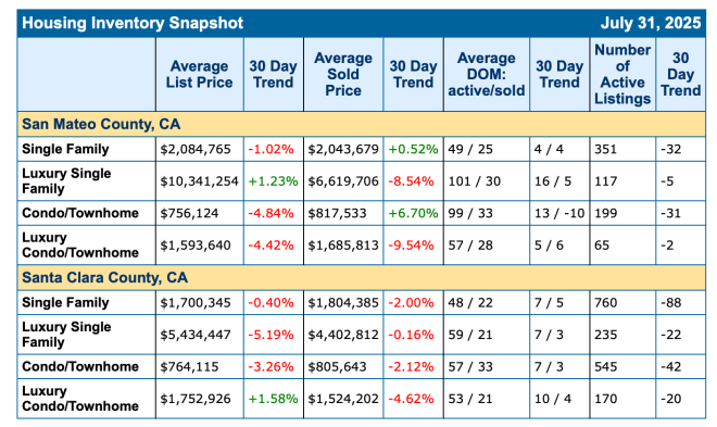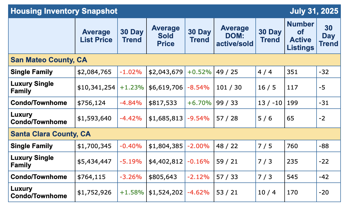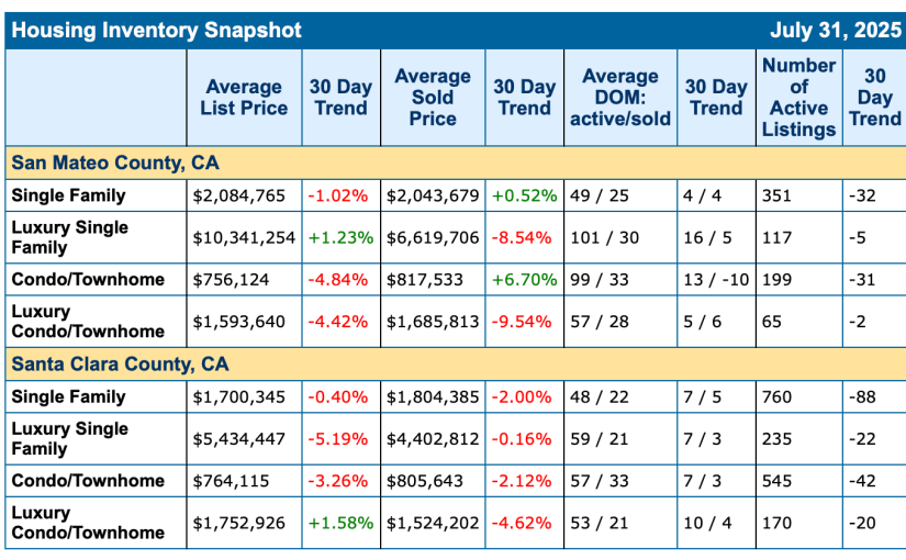The stats are in for July 2025. The last 30 days reflect a softening of the market with values adjusting down. This is part of the normal summer slowdown as folks are off on vacation before summer ends. However, this whole year hits different from the year past. Job changes, market insecurity, and tariffs have many people on the fence about their next move, and who can blame them? However, in my gut, I know this: if you want to live and stay in the Bay Area, the best time to buy is during a weird market. Why, you ask? Well, in our “normal” market, which is characterized by low inventory and high demand, most buyers face multiple offers and often experience huge overbidding. When the market is weird, when other buyers are on the fence, we see opportunity. A home can only be sold once, so when multiple bids are the norm, folks get priced out pretty quickly. This year, not a day goes by that I don’t see a price adjustment down, meaning there is a gap between what sellers want/expect and what buyers can afford. Those interest rates changed things.