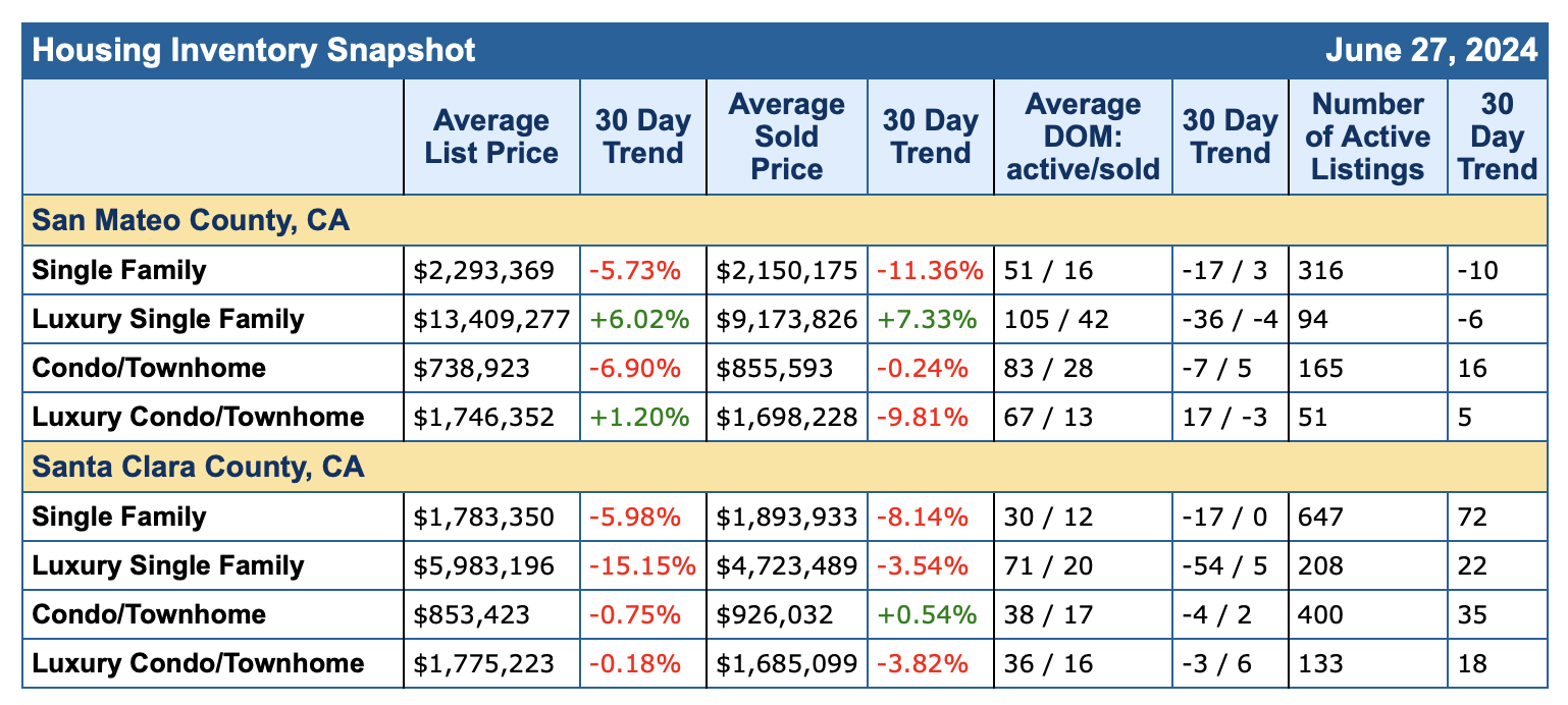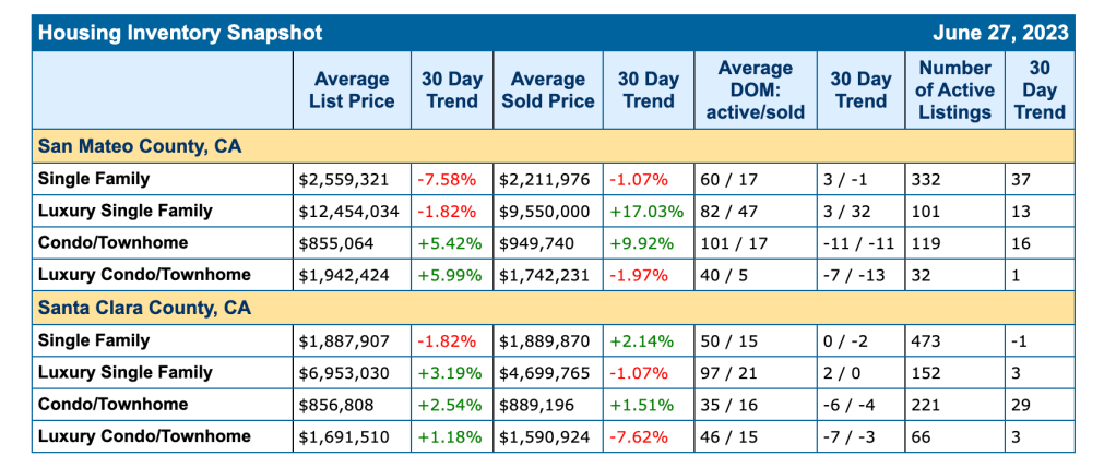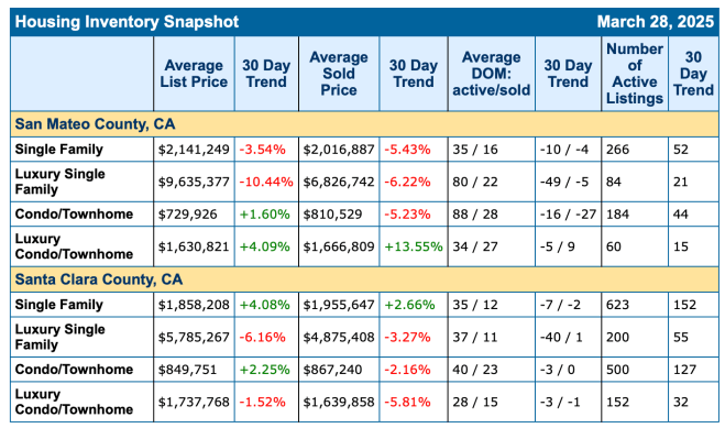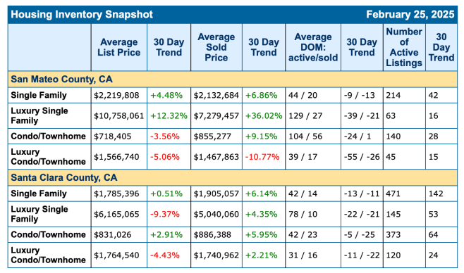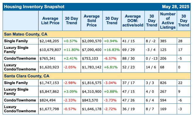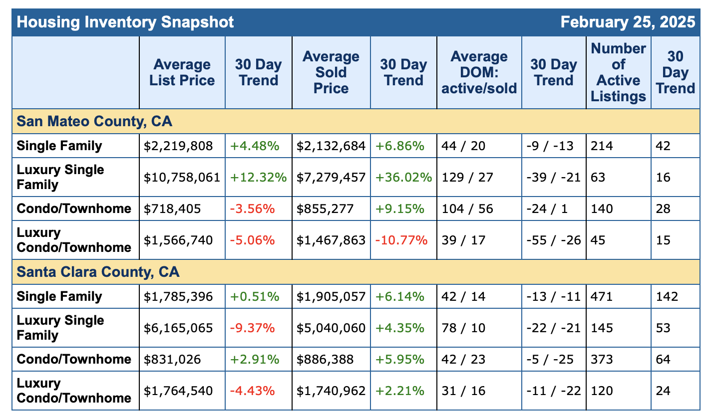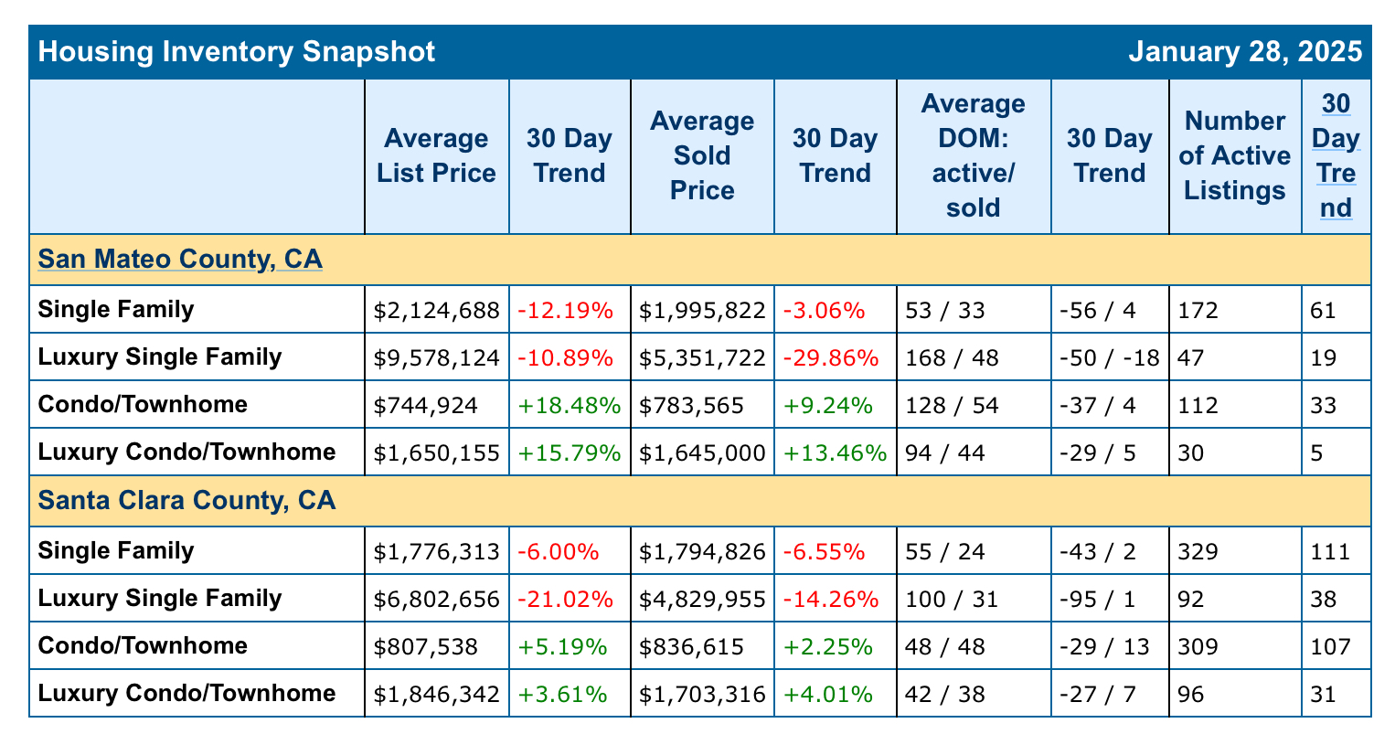 The stats are in for July 2025. The last 30 days reflect a softening of the market with values adjusting down. This is part of the normal summer slowdown as folks are off on vacation before summer ends. However, this whole year hits different from the year past. Job changes, market insecurity, and tariffs have many people on the fence about their next move, and who can blame them? However, in my gut, I know this: if you want to live and stay in the Bay Area, the best time to buy is during a weird market. Why, you ask? Well, in our “normal” market, which is characterized by low inventory and high demand, most buyers face multiple offers and often experience huge overbidding. When the market is weird, when other buyers are on the fence, we see opportunity. A home can only be sold once, so when multiple bids are the norm, folks get priced out pretty quickly. This year, not a day goes by that I don’t see a price adjustment down, meaning there is a gap between what sellers want/expect and what buyers can afford. Those interest rates changed things.