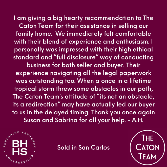 I am giving a big hearty recommendation to The Caton Team for their assistance in selling our family home. We immediately felt comfortable with their blend of experience and enthusiasm. I personally was impressed with their high ethical standard and “full disclosure” way of conducting business for both seller and buyer. Their experience navigating all the legal paperwork was outstanding too. When a once in a lifetime tropical storm threw some obstacles in our path, The Caton Team’s attitude of “its not an obstacle, its a redirection” may have actually led our buyer to us in the delayed timing. Thank you once again Susan and Sabrina for all your help. – A.H.